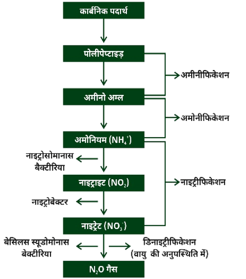 • मृदा में सूक्ष्म जीवों की जैविक क्रिया के द्वारा नाइट्रेट का नाइट्रस ऑक्साइड (N2O) में परिवर्तित होना डिनाइट्रीफिकेशन कहलाता है।