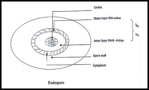 Cells growing in rich media but which are approaching the end of active growth produce endospores. Ageing or heat treatment is needed to activate the dormant spores in a suitable medium. The endospores are extremely resistant to desiccation, staining, disinfectants, radiations and heat. Ex. Clostridium botulinum spores resist boiling for several hours. Most can resist treatment at 80°C for at least 10 minutes. During sporulation, dehydration of developing spores occus. The dehydrated mat be an important factor for heat resistance. All endospores contain dipicolinic acid (DPA) which accounts for 10-15% of spores’ dry weight. It occurs in combination with large amounts of Calcium and is probably located in the core (central part). The Ca-DPA complex formed at advanced stage may possibly play a role in the heat resistance of endospores.