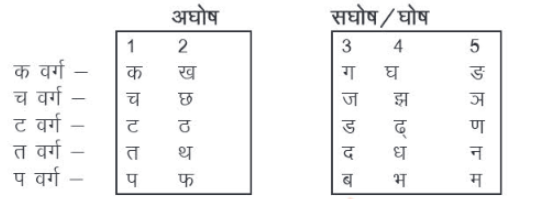 2. व्यंजन – वे वर्ण जिनके उच्चारण में वायु मुख विवर में या स्वर यंत्र में कहीं न कहीं स्पर्श (बाधा सहित) करती हुई बाहर निकलती है, उन्हें व्यंजन कहते हैं।